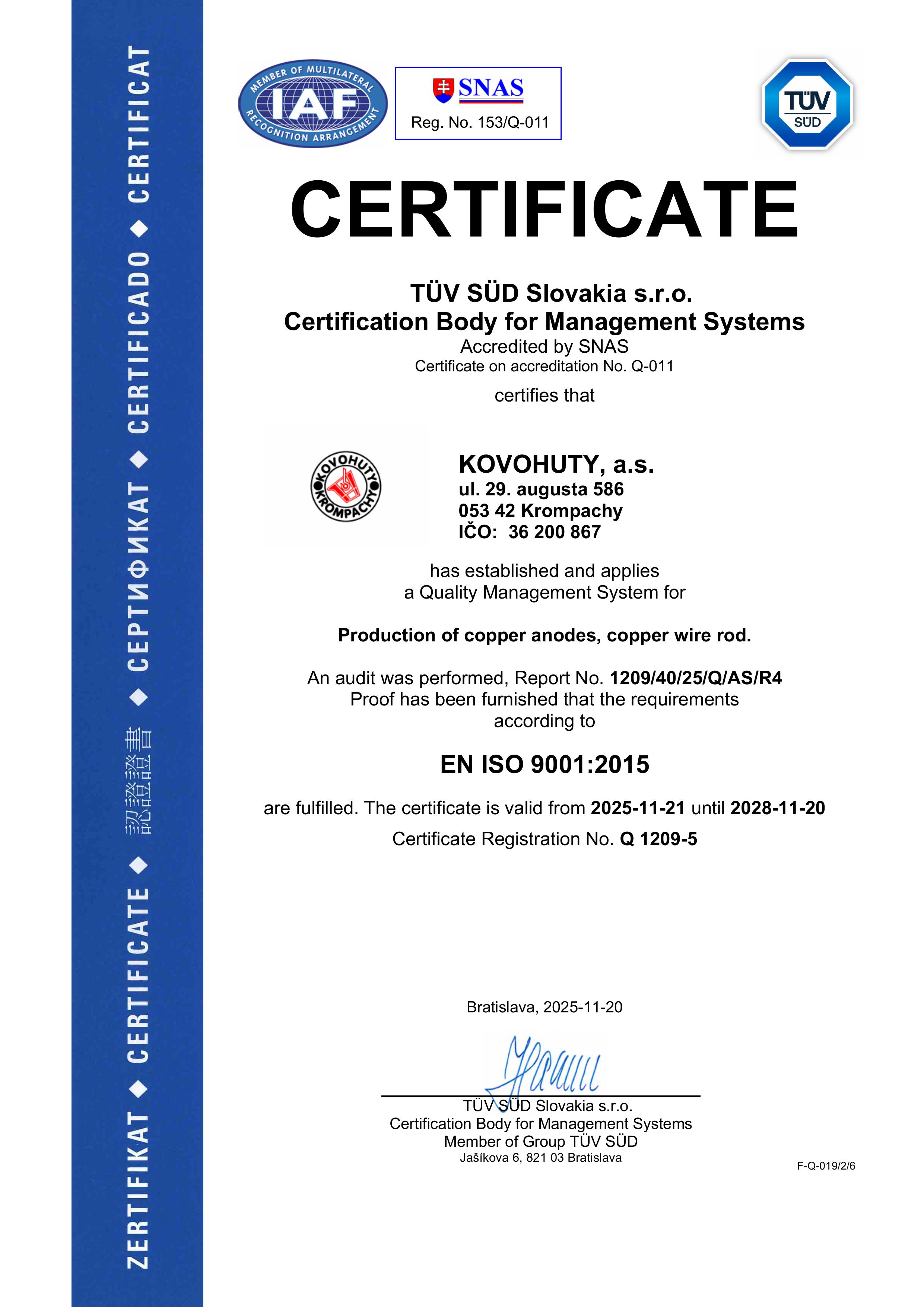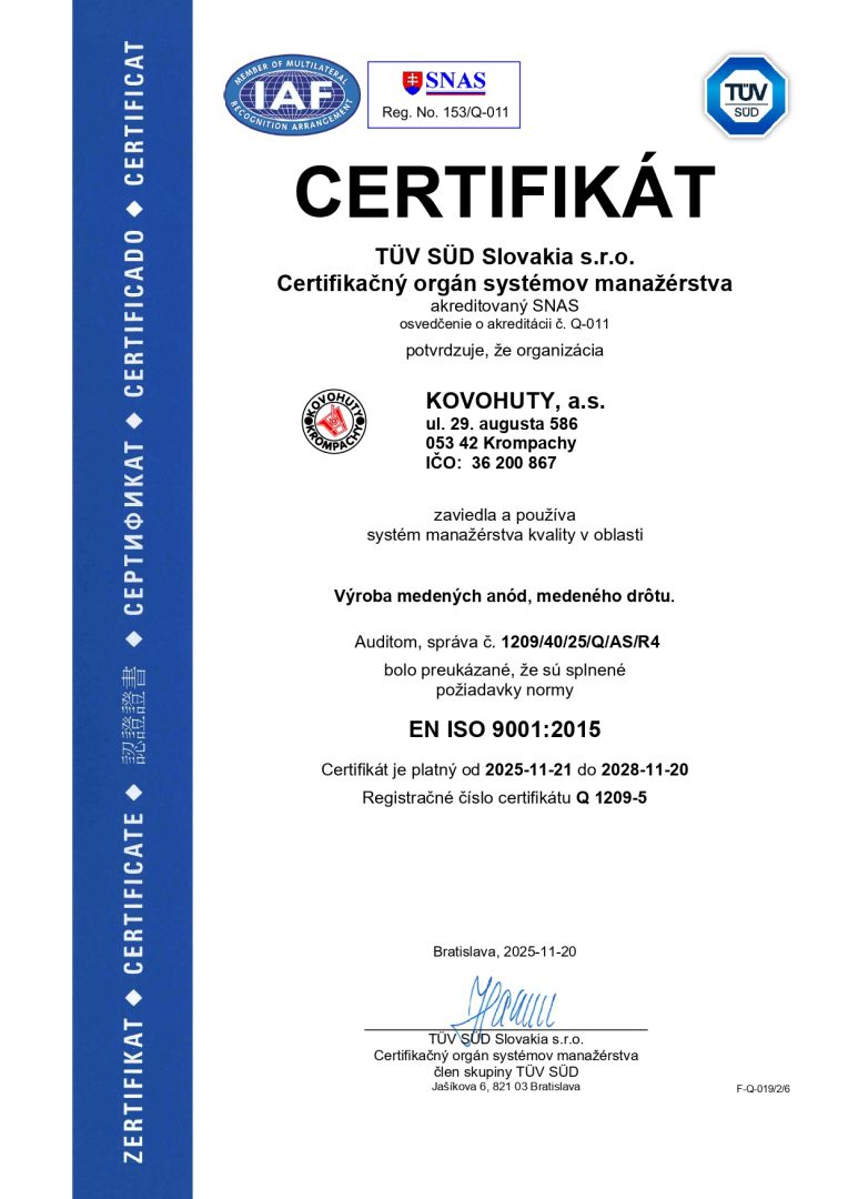 - Začlenenie Montanwerke Brixlegg a Kovohuty, a.s. do medzinárodnej skupiny A-TEC Industries AG, Rakúsko.
